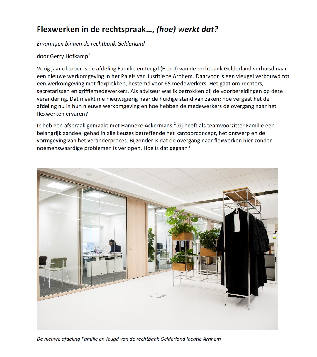 Tijdschrift Trema, hét juridisch vaktijdschrift voor de rechterlijke macht, besteedde onlangs aandacht aan het invoeren van flexwerken binnen de rechtbank Gelderland. Het betreft de afdeling Familie en Jeugd met totaal 65 medewerkers. Auteur Gerry Hofkamp was als a workplace-adviseur vanuit de mantelcombinatie Aestate/ WorkWire, betrokken bij dit project en is benieuwd hoe een en ander heeft uitgepakt. Ze spreekt hierover met Hanneke Ackermans, ten tijde van de transitie teamvoorzitter van de afdeling.